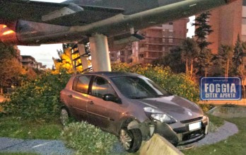 Un insolito 'parcheggio' quello di una Renault Clio alle prime luci dell'alba. il conducente ha perso il controllo andando a terminare la sua corsa proprio accanto al monumento dell'aereo sistemato all'interno della rotatoria in via Telesforo.