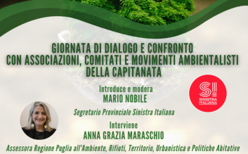 Mercoledì 30 giungo, dalle ore 18.30 alle ore 20.45 presso la Sala della Ruota di Palazzo Dogana (P.zza XX Settembre - Foggia) ci sarà in incontro con l'Assessora regionale alla Ambiente Anna Grazia Maraschio promossa da Sinistra Italiana Capitanata. L'evento si svolgerà nel rispetto delle normative anti-Covid.