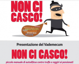 IL MANUALE. “Non ci casco” è un vademecum di autodifesa per contrastare i raggiri che sempre più spesso prendono di mira gli anziani. Nella prima parte, la pubblicazione, stampata in un formato maneggevole e facile da consultare, è incentrata sulle truffe ai danni delle persone fisiche. Il manuale spiega come difendersi da borseggi, sedicenti maghi, inganni del porta a porta. Un intero capitolo è incentrato sugli esempi delle truffe più ricorrenti. I truffatori, per carpire la fiducia delle loro vittime designate, si fingono postini, infermieri, preti. Spesso i delinquenti che intendono mettere a segno i loro “colpi” si travestono da agente delle forze dell’ordine, operaio Enel, pompiere.