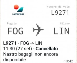 MANCATA PARTENZA. Come ogni sabato il volo L9271 della Lumiwings da Foggia per Milano Linate doveva decollare alle 10,05 del mattino. Tutto era pronto, il personale di bordo e quello dei controlli regolarmente al loro posto. Tuttavia i minuti sono passati invano e l’imbarco non è stato autorizzato. Il volo è stato prima ritardato di un’ora, poi di due e infine cancellato.