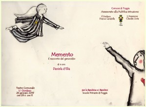 L'Amministrazione comunale di Foggia -attraverso l'Assessorato alla Pubblica Istruzione- ha organizzato per il 28 gennaio, nel Teatro "Umberto Giordano" (con rappresentazioni alle ore 9 e alle ore 11) lo spettacolo intitolato "Memento", un racconto animato scritto e interpretato da Daniela d’Elia per raccontare alle bambine e ai bambini delle scuole primarie del capoluogo cosa fu la "Shoah".