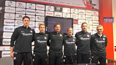 Con la sua “squadra”. Giovanni Stroppa si presenta al gran completo nella conferenza stampa alla vigilia della gara interna con il Melfi, la prima con il Foggia neoopromosso in serie B. Al suo fianco lo staff tecnico e i preparatori atletici con i quali vuole condividere i meriti del trionfo in campionato.