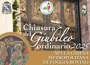 A conclusione dell’Anno Santo 2025, domenica 28 dicembre alle 18 Mons. Giorgio Ferretti, Arcivescovo metropolita di Foggia-Bovino, chiuderà il Giubileo Ordinario 2025 a livello diocesano con una solenne celebrazione eucaristica stazionale che avrà luogo nella basilica Cattedrale di Foggia.