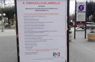 Hanno fatto affiggere dei manifesti in giro per la città sul ‘torcicollo di Landella’. È l’espressione scelta dal Partito democratico di Foggia per accusare il primo cittadino di “nascondere due anni e mezzo di fallimenti amministrativi dietro i fantasmi del passato”. In sostanza – è questo il senso del "manuale di scuse per sottrarsi alle responsabilità" -, per il Pd, Landella rischia il torcicollo perché nell’affrontare i problemi, si volta indietro a incolpare i predecessori.
