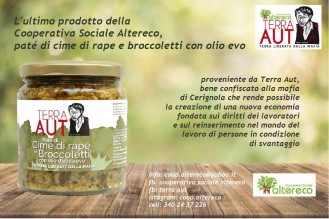 IL PATE'. Dopo l'incontro, su uno sfondo musicale dal vivo a cura dei ragazzi del Liceo Musicale “Carolina Poerio” di Foggia, ci sarà la degustazione di un nuovo prodotto della Cooperativa Sociale Altereco di Cerignola che gestisce Terra Aut, bene confiscato alla mafia cerignolana. Si tratta del “Patè di cime di rapa e broccoletti con olio e.v.o.” che inizialmente sarà disponibile nei punti vendita Ipercoop della Puglia per poi essere distribuito su tutto il territorio nazionale.
