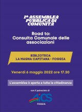 Venerdì 6 Maggio alle ore 17.30 presso la Biblioteca “ la Magna Capitana” è convocata, su iniziativa dell’AICS Comitato Provinciale di Foggia, la Prima Assemblea Pubblica di Comunità della città di Foggia, organizzata per avviare un percorso strutturato tra le diverse realtà associative su come concretizzare al meglio lo sforzo di solidarietà e partecipazione.