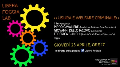 GLI OSPITI. Il primo appuntamento è giovedì 23 aprile, alle ore 17, in diretta sulla pagina Facebook Libera Foggia, con un primo dibattito curato dal presidio di Libera “Nicola Ciuffreda e Francesco Marcone” di Foggia sul tema dell'usura e del welfare mafioso. All’incontro ci saranno anche Pippo Cavaliere, presidente della Fondazione Antiusura Buon Samaritano, e Giovanni Dello Iacovo, giornalista che si occupa da tempo di politiche pubbliche e istituzionali.