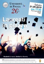 LA FESTA. L’evento, ideato e organizzato dall’Area Orientamento e Placement guidata dalla dott.ssa Rita Saraò, festeggia i laureati Unifg dell’ultimo Anno Accademico che si sono distinti. L’edizione 2019 si terrà sabato 21 settembre 2019, alle ore 17.00, in piazza Cesare Battisti, Foggia. L’elegante agorà cittadina farà da sfondo e cornice alla manifestazione che recita “Studenti si nasce. Dottori si diventa”, per sottolineare che l’Università di Foggia segue i suoi iscritti durante tutto l’iter accademico.