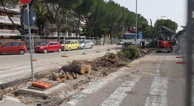 Lavori Via Napoli, a 100 giorni dall'inaugurazione un 'segnale' dal cantiere : abbattuti due pini sui primi 60 metri di strada