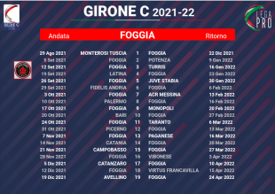 La Lega Pro ha diffuso il calendario del campionato 2021-22. La prima partita dei rossoneri sarà il 29 agosto Monterosi Tuscia-Foggia, l'esordio in casa sette giorni dopo contro il Potenza. L'atteso derby col Bari è previsto per il 10 ottobre al San Nicola e per il 27 febbraio allo Zaccheria. L'ultima di campionato sarà Foggia-Avellino il 24 aprile.