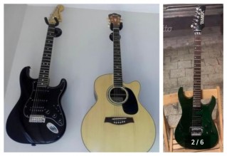 - Fender Stratocaster American special nera (HSS) - Ibanez acustica colore natural con preamp Fishman e albero della vita sulla tastiera (ha un battipenna nero aggiunto da me) e spalla mancante - Hamer Slammer verde - Simil telecaster di liuteria con un elefante intarsiato sul body - Squire Stratocaster made in Korea Bianca anno 92 con pu American standard - Cassa attiva Peavy Inoltre è stata portata via anche una bici fixed verde Tiffany con accessori color cuoio.