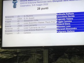 L'ENTUSIASMO. La premiazioni si è svolta a Cesenatico dinanzi al presidente dell'Unione Matematica Italiana, della presidenza della Commissione Olimpiadi di Matematica e dei rappresentanti del Ministero dell'istruzione. "Un plauso va al Dipartimento di matematica del Liceo scientifico Volta di Foggia e, in particolare - commenta con entusiasmo il dirigente scolastico, Gabriella Grilli -, agli allenatori Daniela Nigri, Antonella Pici ed Emanuele Stratakis.