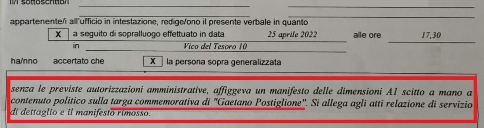 È stato multato dalla polizia municipale del Comune di Foggia per aver oscurato la lapide dedicata a Gaetano Postiglione nei pressi di Palazzo di Città. Mario Nobile dovrà pagare 50 euro oltre le spese di notifica per il suo gesto politico ad alta valenza simbolica. Lo scorso 25 aprile, in occasione della Festa di Liberazione, gli attivisti di Sinistra Italiana coprirono con del nastro rosso anche i cartelli di Via Gentile, Via Almirante e Via Postiglione per manifestare il proprio dissenso all’intitolazione in onore di personaggi che sono stati protagonisti del fascismo.