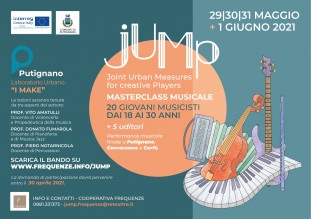 C’è tempo fino a venerdì 30 aprile per inviare la domanda di partecipazione al “Masterclass di musica e concerti”, l’iniziativa gestita dalla cooperativa Frequenze nell’ambito del progetto “JUMP - Joint Urban Measures for creative Players” di cui è capofila il Comune di Putignano. Si tratta di una quattro giorni di full immersion musicale con lezioni tenute da professionisti del settore. Un’occasione per acquisire nuove e diverse potenzialità espressive e tecniche sul proprio strumento. Con la possibilità di potersi esibire in concerto a Putignano, Conversano e Corfù, in Grecia. L’intervento rientra nel Programma di Cooperazione Territoriale Interreg V-A Grecia – Italia 2014-2020 e mira a valorizzare i patrimoni urbani dismessi, attraverso l'industria creativa, sviluppando un modello di gestione già sperimentato in Italia e che sarà trasferito come buona pratica ai partner greci. Nello specifico, l'obiettivo è identificare luoghi urbani inutilizzati che saranno trasformati in centri culturali per spettacoli artistici e culturali.