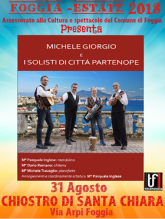 Venerdì 31 agosto presso il Chiostro di Santa Chiara in Via Arpi ci sarà una serata musicale a cura di Michele Giorgio e dei “Solisti di Città Partenope”.