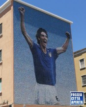 Le braccia al cielo e il volto di Paolo Rossi, il grande “Pablito” che infiammò i Mondiali di calcio vinti dall’Italia nel 1982, campeggiano sui 200 metri quadri del fianco di un edificio popolare nel pieno centro di Foggia.