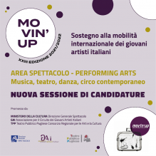 A CHI SI RIVOLGE. “Il Bando Movin’Up Spettacolo-Performing Arts è rivolto ad artisti e artiste tra i 18 e i 35 anni di età che operano con obiettivi professionali e che sono stati ammessi o invitati ufficialmente all'estero da istituzioni culturali, festival, enti pubblici e privati per la realizzazione di progetti nelle seguenti discipline: musica, teatro, danza, circo contemporaneo. Il supporto si configura come rimborso - totale o parziale - dei costi vivi sostenuti per la concretizzazione dei progetti che verranno selezionati da un'apposita Commissione, per lo svolgimento di esperienze di: residenza e/o produzione, co-produzione, circuitazione/tournée, formazione, promozione”.