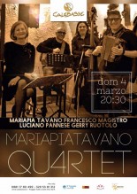 Il fascino del teatro e l'energia dello swing si mescolano nel progetto “Maria Pia Tavano Quartet”, domenica 4 marzo alle ore 20.30 a Calebasse, in via Leone XIII a Foggia. La serata vedrà la nota cantattrice Maria Pia Tavano alternarsi tra monologhi e frizzanti canzoni della tradizione italiana. Accompagnata dal terzetto composto da Gerry Ruotolo (piano e fisarmonica), Francesco Magistro (chitarre) e Luciano Pannese (contrabbasso), il “Maria Pia Tavano Quartet” riesce a creare un’atmosfera magica, una sorta di alchimia, una perfetta interazione tra musica e teatro.