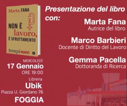 Giornalista d’inchiesta di taglio politico-economico, ricercatrice, tra le personalità maggiormente in grado di animare il dibattito sul tema del lavoro in Italia: quello di mercoledì 17 gennaio, alle ore 19, è un incontro attuale e di taglio economico, politico e sociale. L’autrice Marta Fana – di recente invitata nei principali talk televisivi con riferimenti elettorali e non – ha scritto un libro dal titolo inequivocabile: “Non è lavoro, è sfruttamento” (Laterza, 2017). Lo presenta nello spazio live della libreria Ubik, conversando con Marco Barbieri (docente di Diritto del lavoro dell’Università degli studi di Foggia) e Gemma Pacella (dottoranda di ricerca all’Università politecnica delle Marche).