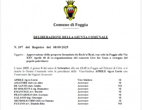 LA NOTA. Sulla vicenda, è arrivata anche una nota di Fratelli d'Italia: "Ciò che desta particolare attenzione - scrivono dal coordinamento cittadino - è la coincidenza temporale tra la nascita della ditta Rock’n’Real e l’evento stesso: secondo i dati ufficiali, l’attività risulta avviata il 14 luglio 2025, appena due mesi prima del concerto previsto per il 12 settembre. Un tempismo che solleva legittimi interrogativi sull’effettiva natura e finalità dell’impresa. In un’epoca in cui esistono numerose piattaforme digitali per la raccolta fondi – sicure, trasparenti e prive di costi per i promotori – appare ingiustificato l’impiego di risorse pubbliche per un’iniziativa che avrebbe potuto essere gestita senza alcun onere economico per il Comune. La delibera evidenzia che l’Amministrazione comunale intende destinare un contributo di €10.000 per l’organizzazione del concerto, mentre nella proposta si specifica che la somma servirà per la gestione della raccolta fondi a beneficio della popolazione palestinese. Tutto ciò è stato deliberato senza alcun bando pubblico né una valutazione sui requisiti, circostanza che, a nostro avviso, rappresenta uno spreco di denaro dei cittadini. Siamo alla vigilia di una importante campagna elettorale per il rinnovo del consiglio regionale pugliese e bisogna essere trasparenti più dell'acqua di fonte per non cadere nel sospetto che tutto sia fatto ad usum delphini. Fratelli d’Italia Foggia chiede chiarezza sull’intero iter amministrativo e invita l’Amministrazione a rendere pubblici tutti i documenti relativi alla selezione della ditta, alla rendicontazione delle spese e alla destinazione effettiva dei fondi raccolti. La solidarietà non può essere strumentalizzata né gestita con leggerezza. È dovere delle istituzioni garantire trasparenza, equità e rispetto per il denaro pubblico. Inoltre, Fratelli d’Italia Foggia interpella la sindaca Episcopo (assente durante la Giunta comunale che ha deliberato) per sapere se fosse informata dell’adozione di tale provvedimento, considerato che, secondo quanto riportato, la suddetta società non risulterebbe iscritta alla Camera di Commercio".