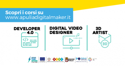 I CORSI. Saranno proprio i tre responsabili aziendali a far conoscere le opportunità professionali offerte dai percorsi di Developer 4.0, co-progettato con Exprivia e 3D Artist e Digital Video Designer, organizzati con Apulia Film Commission e la collaborazione di affermate imprese del settore audiovisivo e hi tech. I partecipanti del primo Open Day potranno così approfondire i profili formativi, i programmi didattici e gli sbocchi professionali relativi a questi nuovi progetti biennali di specializzazione, finalizzati a formare alcune delle più ricercate figure professionali in ambito di Industria 4.0 e Digital Transformation, confrontandosi direttamente con gli esperti di sviluppo app e software, realtà aumentata e virtuale, VFX. Dopo il primo evento sono previste altre sessioni di approfondimento sui corsi e sarà possibile, per gruppi classe o singoli utenti interessati, anche fissare su richiesta appuntamenti per l’orientamento in remoto, scrivendo all’indirizzo: comunicazione@apuliadigitalmaker.it.