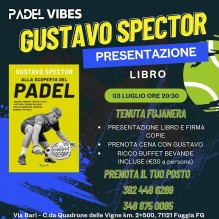 IL LIBRO. Nella serata di mercoledì poi, presso la “Tenuta Fujanera” in Via Bari C.da Quadrone, alle 20.30 Gustavo Spector presenterà anche il suo nuovissimo libro dal titolo “Alla scoperta del Padel” (Rizzoli), prezioso manuale ricco di consigli tecnici ed esperienze emozionali legate allo sport più in voga del momento. L’incontro, in collaborazione con Ubik e ripreso dalle telecamere di Foggia TV, è ad ingresso libero. Segue cena su prenotazione (info: 392.4486269; 3488750085).