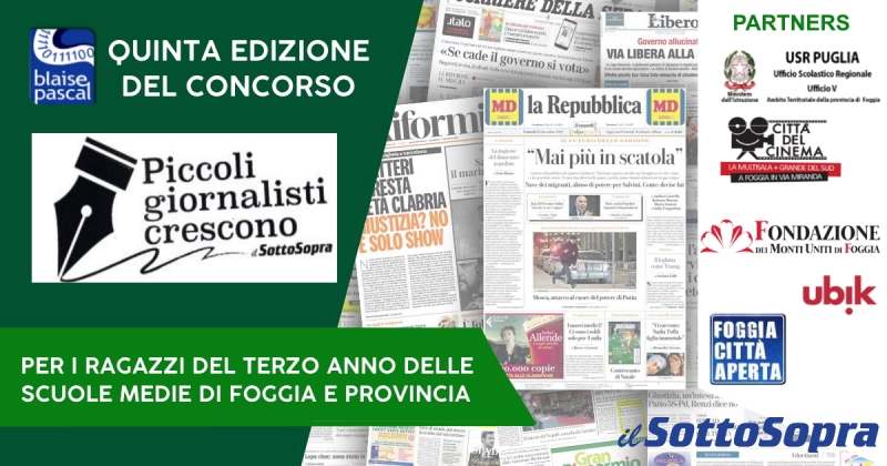 I PARTNER. Il concorso, patrocinato dall’ dall’Ufficio Scolastico Regionale per la Puglia – Ufficio V – Ambito territoriale Foggia, da Fondazione dei Monti Uniti di Foggia, dalla libreria UBIK di Foggia e da La Città del Cinemaè finalizzato ad avvicinare i giovani al giornalismo e all’arte del raccontare i fatti quotidiani, tramite l’attività di comunicazione, per favorire la formazione e lo sviluppo delle coscienze.