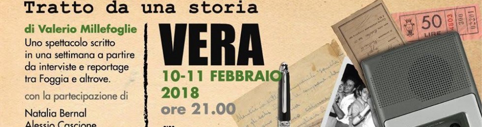 REPORTAGE? TEATRO? ESPERIMENTO NARRATIVO?. Teatro e meta-teatro, dunque. Ma forse, anche realtà e “meta-realtà”, stando almeno al titolo di uno spettacolo singolarissimo, tutto da seguire: “Tratto da una storia vera”. Nel week-end di sabato 10 e domenica 11 febbraio, dunque, alle ore 21, al Piccolo Teatro Impertinente di Foggia (lo spazio teatrale della Piccola Compagnia Impertinente, in Via Castiglione 49), prenderanno vita dieci storie raccolte sul territorio nell’arco di una settimana, in vista di questo interessante esperimento teatrale: un laboratorio di scrittura di reportage narrativi che diventano uno spettacolo vero e proprio, sotto la guida dell’autore Valerio Millefoglie. In scena: Natalia Bernal, Alessio Cascione, Asia Correra, Michele Correra, Victoria Ferreri, Camilla Manzi, Claudia Nardella, Giulia Palumbo, Chiara Panunzio, Giammarco Pignatiello.