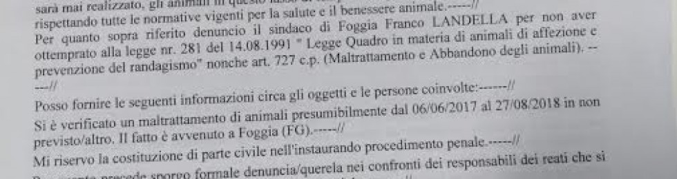 DA GIUGNO 2017 AD AGOSTO 2018. Stando al documento – presentato lo scorso 27 agosto, probabilmente esito dell’ennesimo caso di maltrattamento di un cane avvenuto nella città di Foggia, LEGGI – si sarebbe verificato un “maltrattamento di animali” in un arco di tempo compreso tra il 6 giugno del 2017 e il 27 agosto 2018. In pratica, a quanto si apprende dalla querela, all’amministrazione comunale – e dunque al Sindaco di Foggia – sarebbero ascrivibili molti dei casi di maltrattamento e abbandono di animali avvenuti più o meno di recente nel capoluogo dauno – alcuni dei quali segnalati nella documentazione fornita.