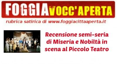 Sono stato a vedere Miseria e Nobiltà al Piccolo Teatro di Foggia. La sfida non era affatto facile, per un regista provare ad adattare un'opera di Eduardo Scarpetta resa celebre da Totò è un po' come se Stroppa cercasse di far giocare il Foggia con gli schemi di Guardiola o se Landella usasse gli slogan di Trump. Anche se, ripensandoci, la proposta di un muro per tenere lontani i baresi avrebbe un suo seguito...