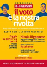 Sabato 12 aprile alle 19 a Foggia in Piazza Giordano ci sarà la manifestazione di lancio della campagna per il SI' ai referendum su lavoro e cittadinanza che si terranno l'8 e il 9 giugno.