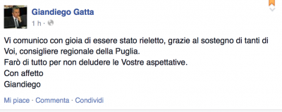 Regionali, Gatta fa festa su Facebook: "Sono stato rieletto"