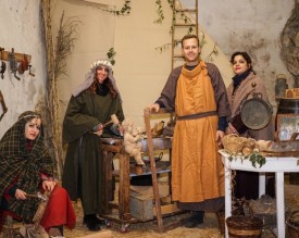 I FIGURANTI. A cominciare dall’antico Castello d’Aquino, ogni luogo d’interesse storico-architettonico e culturale del paese ha un ruolo importante nel Presepe Vivente. Lo spettacolo inizierà alle ore 19, quando prenderà il via il corteo dei soldati dalla Chiesa della Maddalena. Saranno 160 i figuranti in costume d’epoca a riportare in vita i mestieri, le botteghe, le attività domestiche, l’artigianato e il modo di vivere del tempo e della terra in cui nacque Gesù. Spazio anche all’enogastronomia, con tanti piatti tipici e diversi vini che potranno essere degustati. La scena della Natività quest’anno sarà interpretata da un’intera famiglia: il bambinello è nato il 22 ottobre, si chiama Vito, mentre saranno i suoi genitori Laura e Antonino a interpretare il ruolo di Maria e San Giuseppe. Tra i figuranti ci saranno anche alcuni migranti ospiti del SAI (Sistema Accoglienza e Integrazione) e, assieme a tanti giovani, l’attore più anziano impegnato nelle scene ha 79 anni.