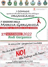 Domenica 27 novembre a Rodi Garganico ci sarà la prima edizione della “Marcia Garganica contro la violenza sulle donne”. L’iniziativa è organizzata da cittadini e rappresentanti istituzionali dei comuni appartenenti al Distretto Socio Sanitario n.53: Vico del Gargano, Cagnano Varano, Carpino, Ischitella, Isole Tremiti, Peschici, Rodi Garganico e Vieste. La partenza è prevista alle ore 19 da piazza Papa Giovanni XXIII, di fronte al Municipio.