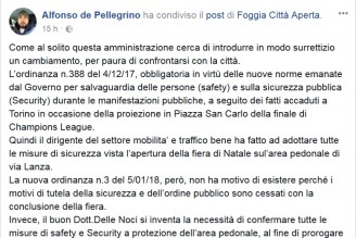 ORDINANZA ILLEGITTIMA. Secondo il coordinatore della segreteria provinciale del Pd, l'amministrazione Landella tenta “di introdurre in modo surrettizio un cambiamento, per paura di confrontarsi con la città”. La proroga, firmata dal dirigente al traffico del Comune di Foggia, Romeo Delle Noci, era stata motivata dal fatto che non si fossero “determinati effetti negativi in ordine alla fluidità del traffico”. LEGGI: “Incidente alla rotatoria di piazza Cavour. Secondo de Pellegrino, però: “il buon dott. Delle Noci si inventa la necessità di confermare tutte le misure di safety e Security a protezione dell’area pedonale, al fine di prorogare la variazione del traffico nelle vie centrali, sine die. Di fatto contravvenendo agli elementi caratteristici di una ordinanza la quale deve indicare una data di inizio e una data di fine”. Per Alfonso de Pellegrino, insomma, l'ordinanza è illegittima, da qui la richiesta al sindaco Landella e al dirigente Delle Noci: “Se volete cambiare la mobilità e traffico in una parte importante della città, perché non lo fate alla luce del sole? Perché non comunicate alla città ciò che avete in mente? Soprattutto smettetela di emanare queste ordinanze illegittime”.