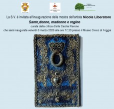 La sacralità dell’archetipo femminile, evocata attraverso una pittura materica neoinformale dagli echi poveristi e impreziosita dalle raffinate suggestioni dell’arte bizantina, è al centro della mostra Sante, donne, madonne e regine di Nicola Liberatore (San Marco in Lamis - Foggia, 1949). L’esposizione, a cura della critica d’arte Cecilia Pavone, sarà inaugurata venerdì 6 marzo alle ore 17.30 negli spazi del Museo Civico di Foggia.