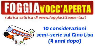 La funzione “Accadde oggi” di Facebook di solito ci fa immalinconire, a volte ci strappa una risata, sporadicamente ci induce perfino a pensare. Oggi ha consentito ad un amico di tirar fuori un mio vecchio articolo satirico sul Gino Lisa scritto il 27 ottobre 2011. Esattamente quattro anni fa avevano deciso di chiudere l'aeroporto. Ieri è uscita la notizia dei dubbi dell'Unione Europea. L'ho riletto, se non fosse che intanto lo Zaccheria l'hanno ristrutturato (all'epoca si pensava di costruire un altro stadio) siamo più o meno allo stesso punto, cioè vicino allo zero.