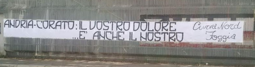 Uno striscione esposto su viale Ofanto, per manifestare solidarietà oltre ogni rivalità calcistica. È quello firmato dalla curva Nord di Foggia, che ha rivolto un pensiero alle vittime della tragedia ferroviaria di ieri. “Andria – Corato: il vostro dolore…è anche il nostro”