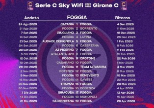 Si apre a Catania, si chiude a Salerno. Sono stati pubblicati i calendari dei gironi di Serie C: il Foggia sarà impegnato in trasferta, all'esordio, al Massimino nel turno del 24 agosto. Il primo impegno allo Zaccheria sarà una settimana dopo, contro il Sorrento. Si gioca poi a Giugliano la terza giornata, in casa contro il Latina la quarta e a Cerignola il quinto turno. La prima gara infrasettimanale sarà il 24 settembre contro la Casertana, prima della doppia trasferta di Picerno e Bergamo, per affrontare l'Atalanta Under 23.
