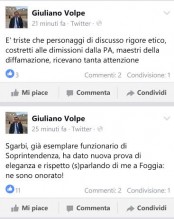 I POST. Ieri, Sgarbi è tornato alla carica e ha rinnovato le accuse (che ci sarà occasione di replicare anche oggi sul palco). E Volpe ha reagito con due post sui social network: “Sgarbi, già esemplare funzionario di Soprintendenza, ha dato nuova prova di eleganza e rispetto (s)parlando di me a Foggia: ne sono onorato!” e un ancor più pesante “E' triste che personaggi di discusso rigore etico, costretti alle dimissioni dalla PA, maestri della diffamazione, ricevano tanta attenzione”.
