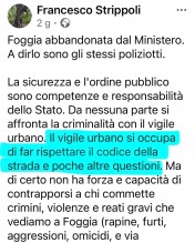 Preoccupazione. E' quella che il coordinamento cittadino di Fratelli d'Italia esprime per le recenti dichiarazioni del consigliere comunale Francesco Strippoli, secondo cui “il vigile urbano si occupa di far rispettare il codice della strada e poche altre questioni”. Una definizione - ripresa da un post in cui il consigliere di maggioranza replicava alle invettive (politiche) sulla gestione della sicurezza a Foggia, sintetizzando eccessivamente le mansioni degli agenti - che per il partito di centrodestra è "riduttiva e fuorviante, che non rende giustizia al lavoro svolto quotidianamente dalla Polizia Locale sul territorio".