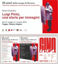 IL PROGRAMMA DI INIZIATIVE. Il programma di eventi si apre lunedì 27 maggio alle ore 17.30 con l’inaugurazione della mostra fotografica “Luigi Pinto, una storia per immagini”, ospitata al primo piano di Palazzo Dogana in Piazza XX Settembre. A seguire, alle ore 18 nella Sala del Tribunale, vi sarà la proiezione della docuintervista con Lorenzo Pinto “Ne nascono altri cento”, realizzata dal Coordinamento antifascista foggiano. A seguire un’esecuzione musicale dal titolo “Le ultime ore di Luigi Pinto”, balla scritta ed eseguita da Bruno Caravella. Venerdì 31 maggio, sempre presso la Sala del Tribunale di Palazzo Dogana, si terrà il convegno “50 anni dalla strage di Brescia”. Tra i relatori il magistrato ed ex senatore Giovanni Pellegrino, che fu relatore della Commissione d’inchiesta sulle stragi; Manlio Milani, presidente dell’Associazione Caduti di Piazza della Loggia; Ferdinando Pappalardo, vice presidente nazionale dell’Anpi; Laura Castelletti, sindaca di Brescia. Porteranno il saluto il presidente della Provincia di Foggia, Giuseppe Nobiletti, e la sindaca di Foggia, Maria Aida Episcopo. Sabato 1 giugno, alle ore 10, vi sarà la cerimonia di deposizione di una corona di fiori alla stele che ricorda Luigi Pinto sull’omonimo viale della città. Alle ore 20, al Teatro Umberto Giordano, con ingresso gratuito tramite prenotazione dei posti (presso le sedi Cgil e Flc di Foggia), andrà in scena lo spettacolo teatrale “Gino”, prodotto dal Teatro della Polvere con testo di Marcello Strinati e regia di Mariangela Conte e musiche di Antonio Cicognara.
