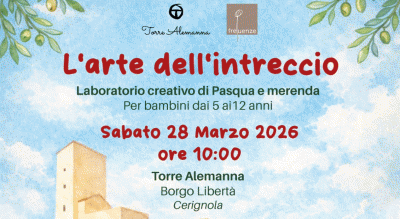 A Torre Alemanna, a pochi giorni dalla Pasqua, la creatività non si ferma e torna con un nuovo laboratorio creativo dedicato ai più piccoli. Sabato 28 marzo 2026, alle ore 10.00, il Complesso Museale di Borgo Libertà (Cerignola) apre le sue porte per un’esperienza in cui la manualità è protagonista. Guidati dall’Arte dell’intreccio i bambini dai 5 ai 12 anni vivranno un laboratorio creativo di Pasqua e merenda realizzando graziosi cestini che porteranno a casa riempiti di golosi ovetti di cioccolato. Un’occasione per mettersi in gioco, creare con le proprie mani e divertirsi insieme. Al termine del laboratorio li aspetterà un momento di degustazione da condividere insieme.