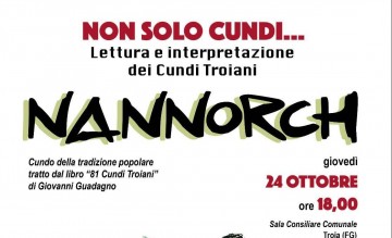 Proseguono gli incontri dell'iniziativa “Non solo Cundi...”, il progetto ideato e realizzato dala Fondazione Nuova Specie in collaborazione con il Laboratorio Teatrale Limax e con le Associazioni La Melagranata, la Pro Loco di Troia e Italia Nostra Sezione di Troia che prevede la lettura, l'interpretazione scenica e il commento dei racconti della tradizione troiana. Domani, giovedì 24 ottobre alle ore 18, presso la sala consiliare del Comune, dopo “Il principe porco” e “Cumma 'Att” sarà la volta di “Nannorch”.
