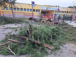 L'albero è finito sull'asfalto, abbattendosi anche su parte della cancellata, pochi minuti prima dell'uscita di scuola di alunni e personale scolastico. Non si sono registrati feriti.