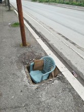 In Via del Mare per coprire una grossa buca, che forse doveva contenere un albero o un tombino, qualcuno ha usato una sediolina.