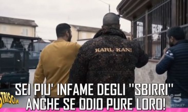 LE MINACCE. Nel videoclip si vede il cantante, con un folto gruppo di ragazzi di San Bernardino che interagiscono con lui, mentre intona esplicite minacce all’inviato di “Striscia”, accompagnando le parole con chiari gesti che imitano l’esplosione di colpi d’arma da fuoco.