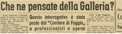 IL ‘REFERENDUM’. Sebbene sostenuta da più parti, non si capiva, peraltro, chi e come dovesse finanziare una tale opera che prevedeva costi altissimi e con una quasi certa ipotesi di fallimento ed a rischio di trasformare Piazza Cavour in un cantiere a cielo aperto per decenni. A questa idea, si contrapponeva quella di quanti , la maggior parte dei foggiani di qualsiasi livello socio culturale e professionale, anche attraverso una sorta di referendum lanciato dai giornali, erano contrari alla galleria e per nulla volevano rinunciare alla freschezza e alla rassicurante amenità della storica villa comunale, unico luogo dove poter portare i figli a passeggio ed a prendere una boccata di aria sana, lontani dai pericoli delle strade e delle piazze. Nella famosa seduta consiliare del 12 luglio 1949, fu comunque e salomonicamente deciso, come abbiamo detto, di “dar luogo” alla realizzazione della galleria e di spostare (sic!) il portico in altra zona. Insomma, si voleva, per dirla con il Conte Franchini, di vecchia memoria, “Portare il mare a Foggia…” o almeno questo e ciò che i sostenitori della galleria facevano credere ai foggiani nei loro discorsi: palesando il lustro, benessere e ritorno economico che un’opera “grandiosa” come la galleria avrebbe significato per la Città e citando come esempio Roma e Milano.