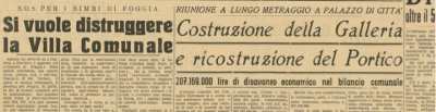 UN RICORDO. Ebbene, cari concittadini, sappiate che, causa l’atavica propensione per i nostri amministratori a mettere al primo posto dei loro pensieri la speculazione edilizia e abbattere tutto ciò che, a prescindere dalla importanza storica, può essere abbattuto, per costruire nuovi e, a volte, obbrobriosi palazzi, tutto quello che avete appena letto, poteva essere solo un lontano ricordo. Come!, direte. Si, perché, molti dei foggiani nati dopo la guerra (la seconda, per precisione), non immaginano quando si sia andati vicino al rischio di ritrovarsi, al posto della villa che oggi vediamo, una larga e lunga strada con albergo, palazzi e… ciliegina sulla torta, una mega galleria. Si, avete letto bene: una vera e propria galleria che, nella mente di quanti la sognavano, doveva fare concorrenza nientemeno che a quella di Napoli, Roma e Milano. Tutto vero, documentato. Scritto nero su bianco nei verbali dei consigli comunali e riportato nelle cronache dei giornali che si interessarono alla questione tra il 1947 e il 1950: vale a dire da quando vennero stanziati i fondi per la ricostruzione della villa, in particolare del pronao completamente distrutto dai bombardamenti, al 1950, data della sua ricostruzione, per fortuna.