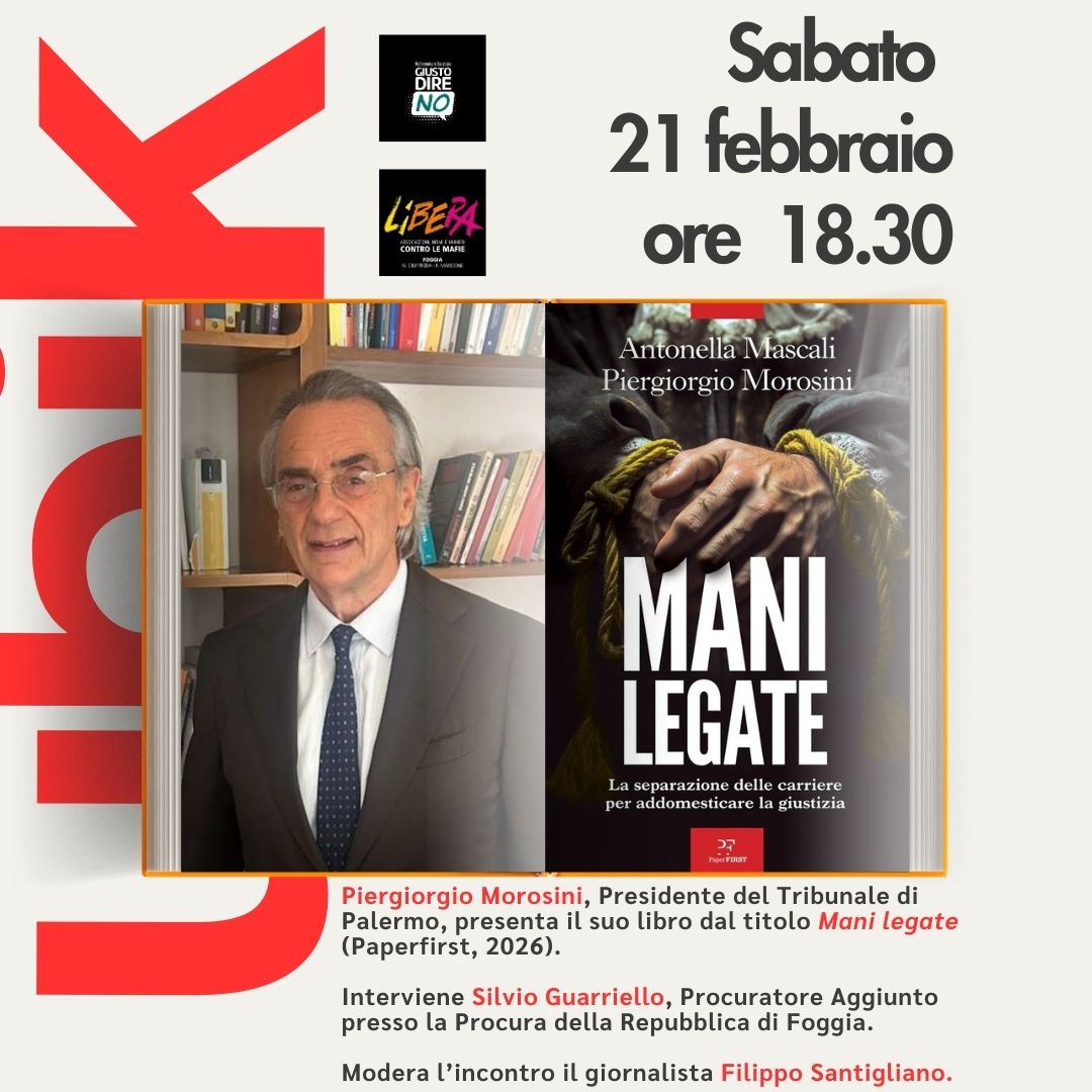 Quali riflessi produrrebbe la riforma sulla giustizia, l’ormai famosissimo referendum, sulla qualità della nostra democrazia? La risposta è “Mani legate” (PaperFIRST, 2026), il libro scritto a quattro mani dalla giornalista Antonella Mascali e dal giudice Piergiorgio Morosini. Sarà proprio quest’ultimo a intervenire, sabato 21 febbraio alle ore 18.30 negli spazi della libreria Ubik di Foggia.